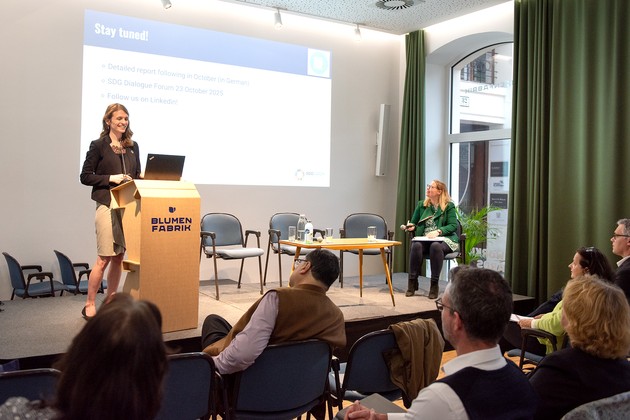 Auch die Rolle der Zivilgesellschaft und die Kommunikation von Lücken und Zielen der SDG-Umsetzung wurde diskutiert. Dabei stand nicht zuletzt die Frage im Raum: Können wir positivere Bilder in der Kommunikation schaffen und gleichzeitig Entscheidungsträger:innen zu Maßnahmen bewegen, die dem Ernst der Lage gerecht werden?